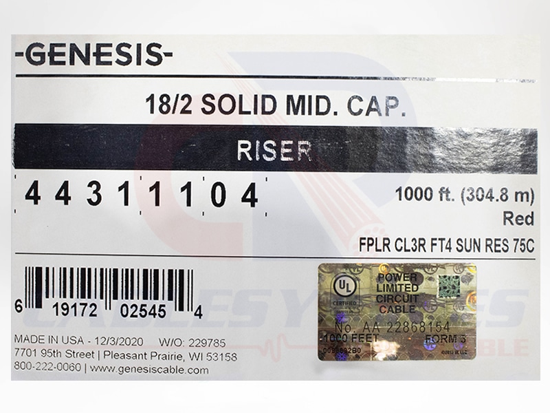 GEN-44311104 Genesis Fire Alarm Midcap Unshielded 2Cond 18AWG FPLR/Cl3R