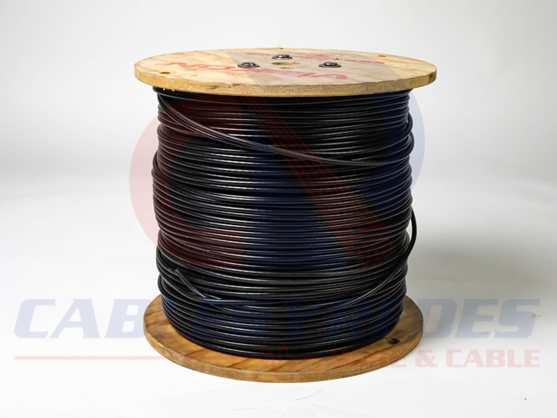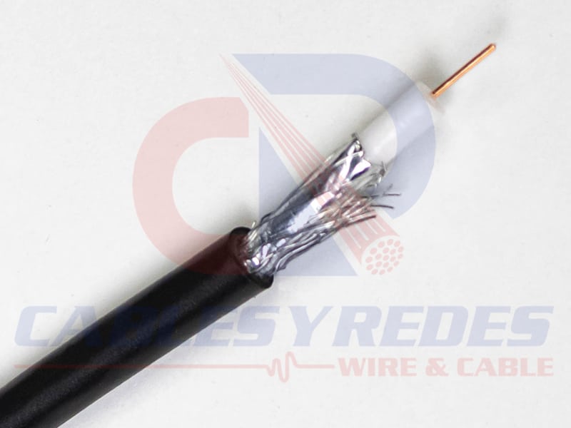 Cable coaxial constituido por un conductor central de acero con recubrimiento de cobre (copper-clad steel), aislamiento de polietileno espumado, blindaje doble formado por una cinta aluminizada más una malla trenzada de alambres de aluminio y cubierta exterior de policloruro de vinilo (PVC).